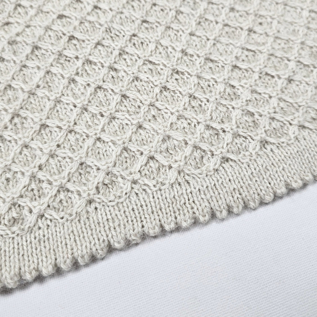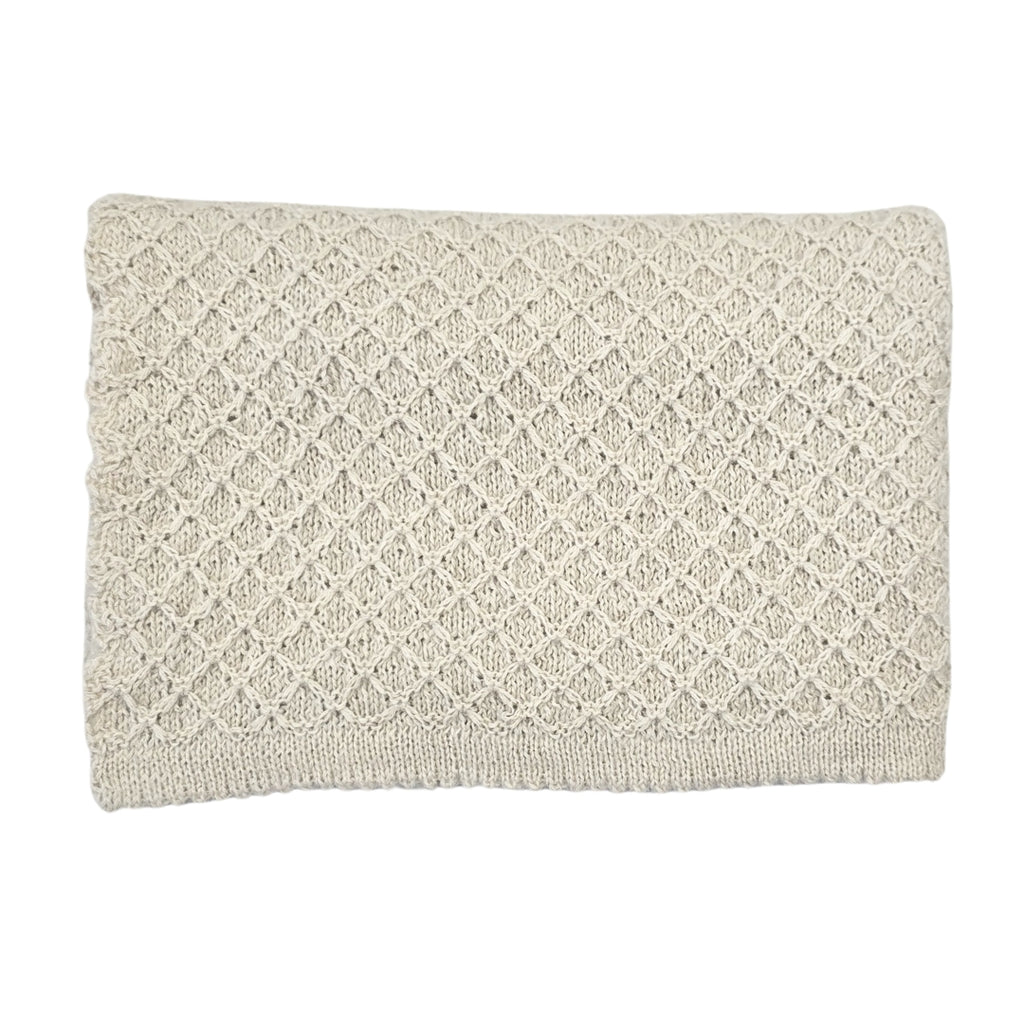 Knitted in a delicate diamond-textured stitch and finished with the sweetest picot edging. Ideal for prams, cribs, and eventually little laps, it’s a timeless piece that grows beautifully with your child.