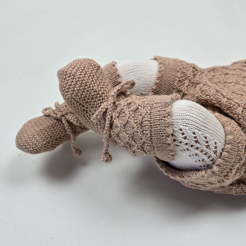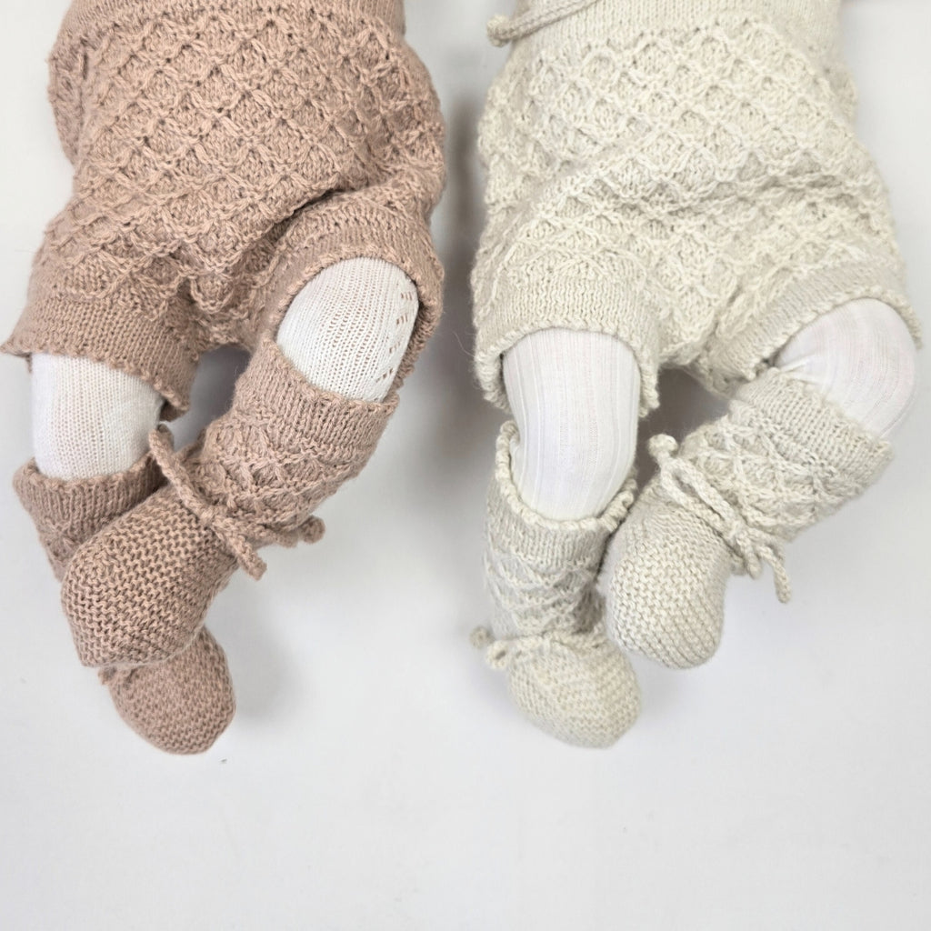 These booties are knitted in a delicate diamond-textured stitch and finished with the sweetest picot edging and ties at the ankle to keep them secure.