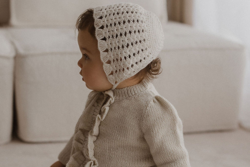 Our very first crochet bonnet is made for memorable moments—a little heirloom to hold onto.