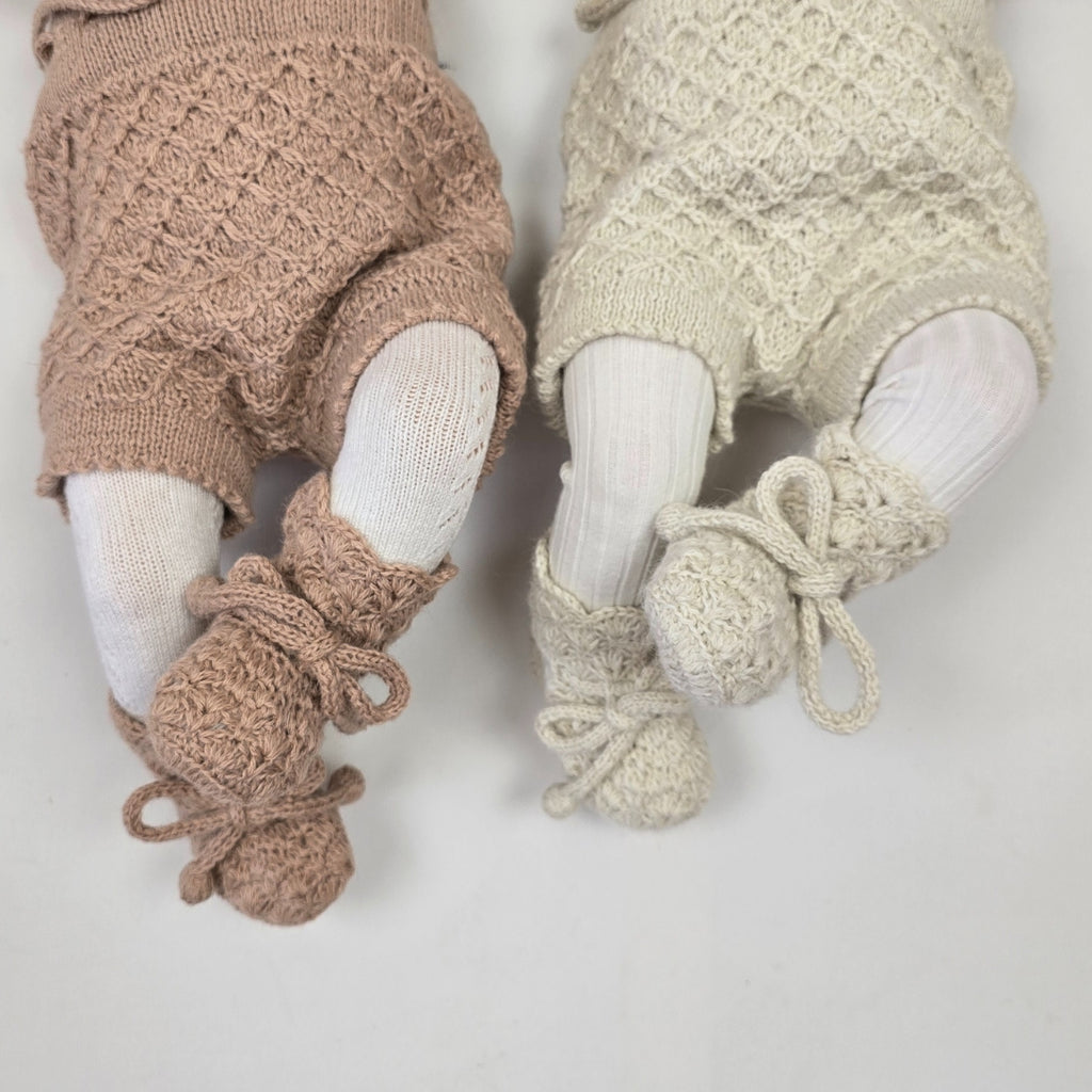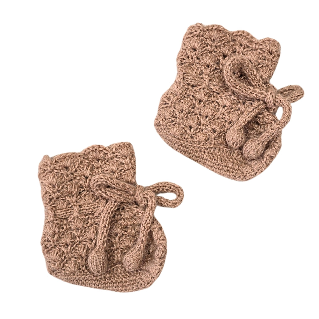 Our very first crochet booties, seamlessly hand crafted with a sweet scallop-stitch edge and ties at the ankle to keep them secure.